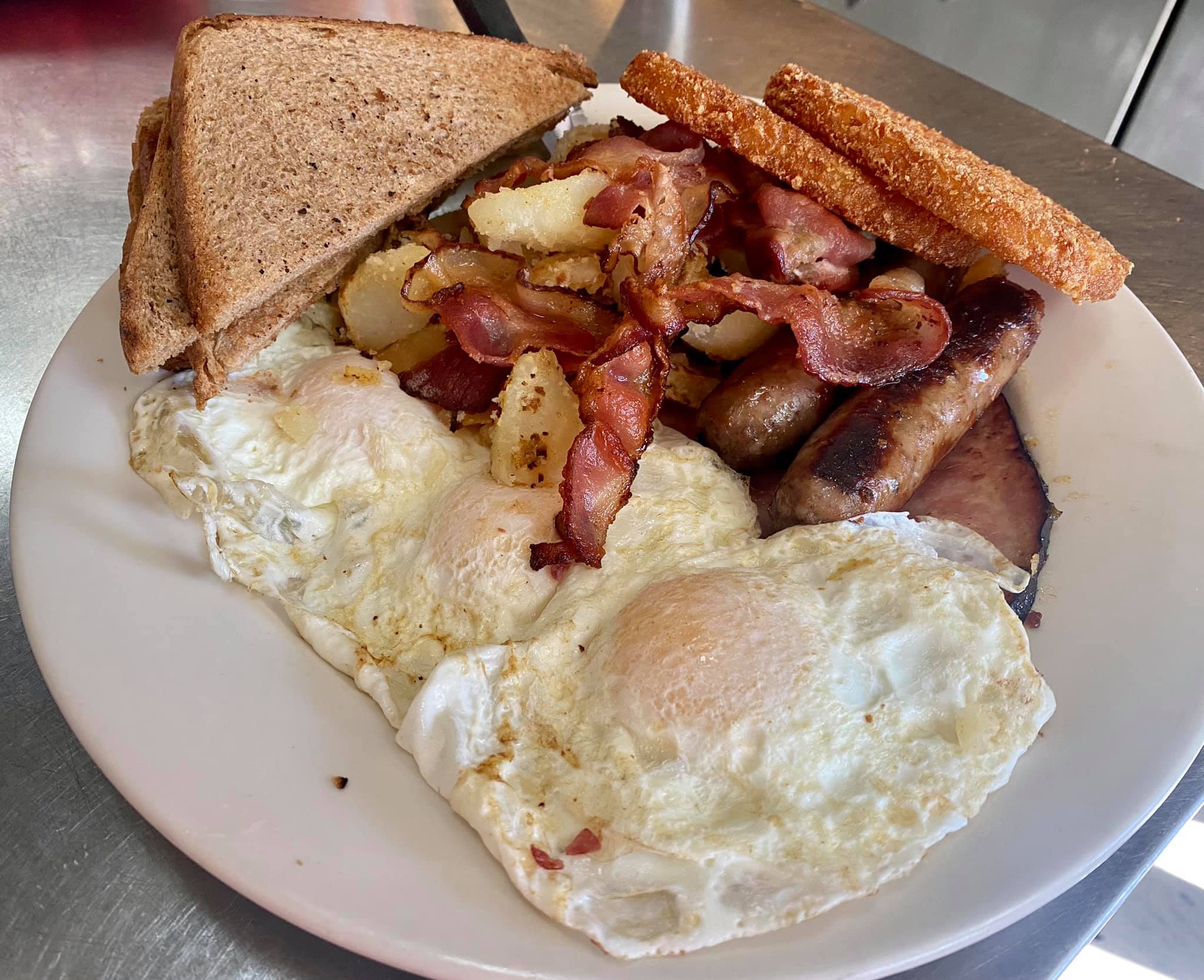 3 Eggs, 3 Meats, Homefries & Toast. We dare you not to pop a button later… 😁🌝
